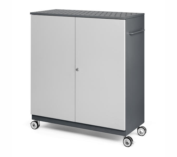 Armário de transporte desenhado com chapa reciclada de 0,8mm, ecológico e funcional. Os portáteis são transportados na posição horizontal. Porta dupla com alta de segurança. Orifícios de ventilação na parte traseira, inferior e superior. Instalação elétrica através de interruptor magneto-térmico. Reservas de energia com botão liga/desliga.