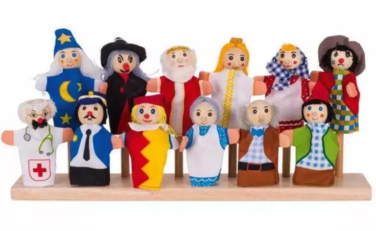 Conjunto de 12 marionetas com corpo em tecido e cabeça em madeira.