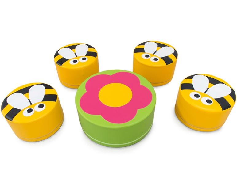 Conjunto composto por uma mesa flor e 4 bancos abelha com figuras costuradas, em tela lavável e impermeável e interior em espuma. Fundo antiderrapante.