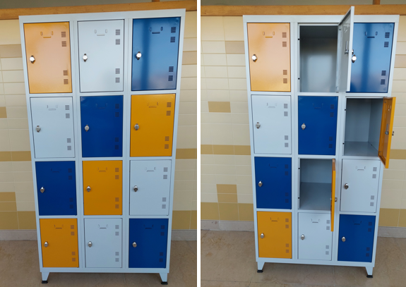 Vestiário Metálico triplo com 12 cacifos, em chapa de aço de 0,8 mm e pés de 1,5 mm.